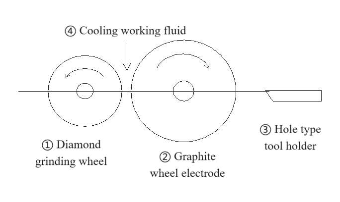 Electrodo da roda de grafite: use uma roda de grafite fácil de processar como eletrodo, aplique o princípio da usinagem de descarga e use uma faísca elétrica para remover a parte da roda de moagem de diamante a ser processada. O orifício externo da roda de grafite é girado e formado por um cortador de orifício preso no suporte da ferramenta.
